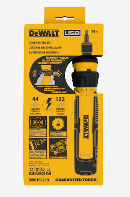با FLEXDRIVE 14 pc برنامه های مونتاژ را سریع انجام دهید. ست پیچ گوشتی شارژی. پیچ گوشتی دارای طراحی جمع و جور است که به راحتی در کیسه ابزار شما قرار می گیرد، با یقه 360 درجه FLEXDRIVE برای کنترل بدون درز اسلاید به درایو. پیچ گوشتی شارژی FLEXDRIVE با تنظیم گشتاور 6 مرحله ای و باتری یکپارچه قابل شارژ 2 آمپر ساعتی، حداکثر 680 پیچ دستگاه را در هر بار شارژ ارائه می دهد*. *پیچ دستگاه 1/2 اینچ شماره 6 برای اتصال کلید برق یا صفحه دیواری خروجی، با استفاده از کلاچ ابزار سطح 2 ** با شارژرها و کانکتورهای USB-C کار می کند. انجمن پیادهسازان USB دارای ثبت علامت تجاری برای USB-C است و این محصول را تأیید، تأیید یا تأیید نکرده است. ***با استفاده از هر منبع برق استاندارد 15 وات یا بیشتر ****TORX® یک علامت تجاری ثبت شده Acument Intellectual Properties، LLC است که تحت مجوز استفاده می شود.