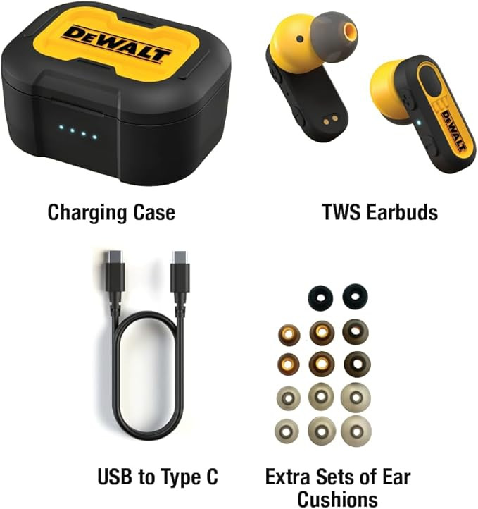 | نام مدل | هدفون بلوتوث بیسیم واقعی DEWALT — هدفون بلوتوث TWS — هدفونهای بیسیم با جعبه شارژ نوع C — هدفونهای بیسیم ضد آب — صدای ممتاز Jobsite Pro-X1 برای کار در فضای باز |