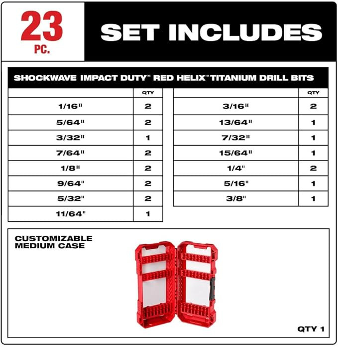 مجموعه مته تیتانیوم MILWAUKEE SHOCKWAVE Impact Duty™ 23PC RED HELIX™ برای دوام و عمر طولانی طراحی شده است. نوک QUAD EDGE یک شروع دقیق را ارائه می دهد و دارای چهار لبه برش برای ایجاد تراشه های کوچکتر برای حذف سریعتر مواد و حرارت کمتر است که منجر به بهبود عملکرد می شود. طراحی شده با فلوت VARIABLE HELIX™ که با زاویه مارپیچ تهاجمی 35 درجه شروع می شود و برای برداشتن سریع براده ها به 15 درجه ختم می شود. بیت ها همچنین دارای یک شبکه مخروطی ضخیم داخلی هستند که استحکام را به شدت افزایش می دهد و شکستگی زودرس را کاهش می دهد. ایده آل برای کاربردهای مختلف از جمله اما نه محدود به چوب، پلاستیک و فلزات. متههای تیتانیوم MILWAUKEE RED HELIX™ در مقایسه با متههای اکسید سیاه تا 5 برابر عمر میکنند. این مجموعه در یک کیف لوازم جانبی قابل تنظیم طراحی شده برای استفاده در PACKOUT™ سازماندهی شده است.